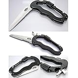 5つの機能、ナイフ、波刃ナイフ、栓抜き、プラスドライバー、マイナスドライバーが収まった、カラビナ型マルチツール。